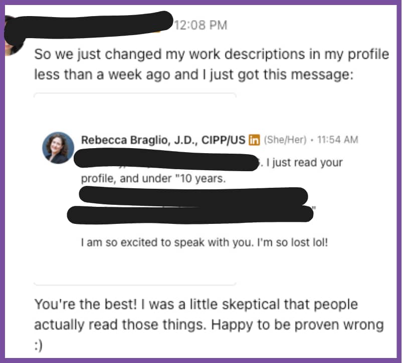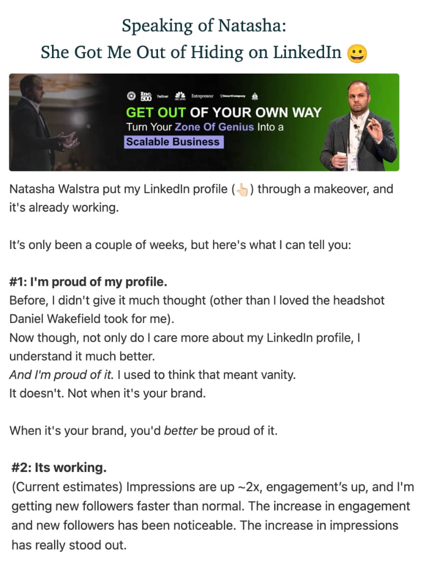 Hey Reader, Yes. People read your profile. Not everyone, but if they're considering working with you, they're curious about a post you shared and want to learn more, or someone referred you to them, they're going to check out your profile. But I get it, most of you are skeptical. Heck, my own client was - until a week after we updated her profile and she got this message: "I just read your profile....I am so excited to speak with you. I'm so lost lol!' And literally two weeks of working with Nick, he shared in his newsletter how changing his profile impacted him - not just by being proud but also actual metrics: "Impressions are up ~2x, engagement’s up, and I'm getting new followers faster than normal." Why this mattersProfile optimization isn't vanity. It's not optional. It's your foundation. When you're proud of your profile, everything else gets easier. You're not hiding anymore. You're not cringing when someone looks you up. You're not making excuses for why your LinkedIn "isn't updated." You show up differently. And people notice. My client went from skeptical to "happy to be proven wrong" in less than a week. Nick went from hiding to having a profile he actually wants to share. Action > perfectionBy the way, that client I just mentioned? She doesn't have her full branding done yet. That's in the works. But you know me - I'm all about action over perfection. So we created an interim brand while her full branding is being done. (LinkedIn is my area, I know when it's out of my zone!) The point? You don't need everything to be perfect to get started. You just need to take the first step. So here's my askGo look at your profile right now. Are you proud of it? If someone landed on it today, would they understand: If the answer is no, fix it. And if you need help? That's what my program includes - profile optimization, messaging, and branding (interim or otherwise). Because I can't help you hide anymore. It's time to get visible. Until next time, P.S. It’s the final opportunity to get the Founding Member rate for my next cohort AND lifetime access to the community - because, yes, I am building a community! Next cohort starts in January. Who’s ready to kick the year off with a serious bang!? DM me “LFG” for deets. Or join the waitlist which locks you in at the current price. |