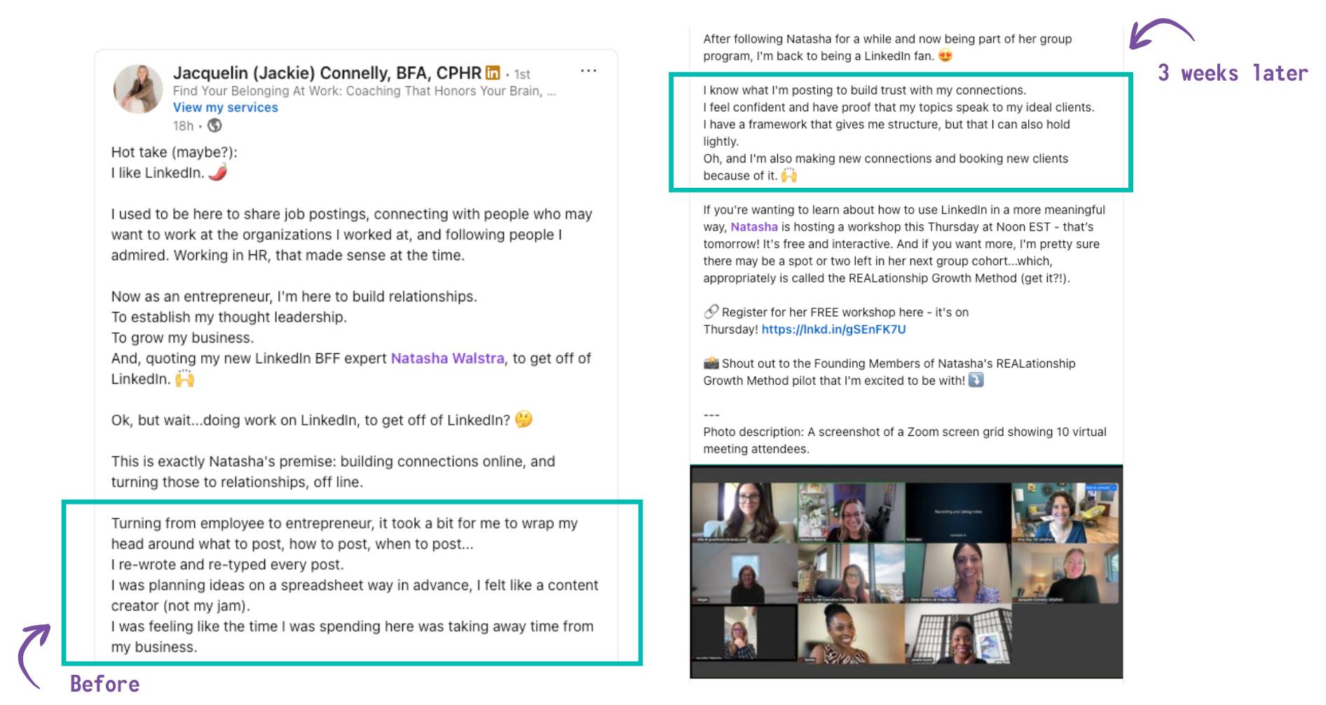 She was drowning in the "more." What she needed was LESS. Less second-guessing. The actual shiftJackie got a framework that gave her structure without making her feel rigid. She learned what to post that actually builds trust (not just gets likes). She stopped treating LinkedIn like a stage performance and started treating it like... well, like building relationships. The result? She actually enjoys it now. And it's working. If you're feeling what Jackie felt beforeYou don't need more tactics. You need clarity on: When you have those pieces? LinkedIn stops feeling like a chore. You stop rewriting posts five times. You stop planning weeks in advance because you're scared you'll run out of ideas. You post. You have conversations. You book clients. The community piece that's missingWhat I've learned after working with 70+ business owners? LinkedIn is constantly evolving. You can't "learn it once" and be done. That's why the people who come through my program don't just get a framework and disappear. My first cohort is transitioning into ongoing community support shortly - office hours, guest speakers, the accountability that keeps you sharp. Becuase this is about building something sustainable, not just getting you to graduation. My second cohort just kicked off. And January is halfway filled. (And what's so cool, about 25% of people in my cohort are past clients who came back because they still see the value!) If you're curious what that looks like, let's chat. Remember Jackie's shift wasn't about doing MORE. It was about getting clear on what actually matters. Until next time, P.S. The framework Jackie mentioned? It's my "Know, Like, Trust Content" framework and simplifies things so much. You don't need fancy tactics. You need clarity on what each piece of content should accomplish. And it works! This is one of the 3 pillars we cover in the REALationship Growth Method: personal branding, content, and social selling. You get it all. β |