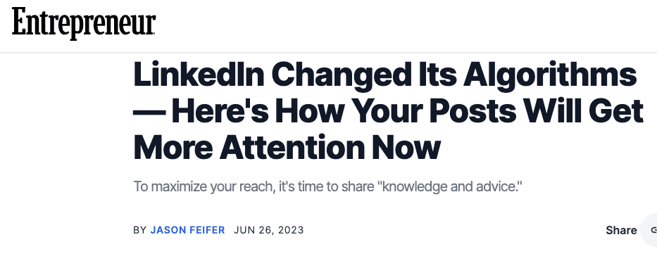 Hey Reader! Everyone keeps talking about the algorithm. I know, I'm guilty of it too. 🙊 But I'm not talking about it in that panicked, sky-is-falling way…like I said before, I'm not really bothered by it. 2 years ago (almost to the date!) an article in Entrepreneur Magazine came out: ​LinkedIn Changed Its Algorithms — Here's How Your Posts Will Get More Attention Now​​ Jason Feifer, editor-in-chief, interviewed Dan Roth (LinkedIn's editor in chief) and Alice Xiong (director of product management who leads LinkedIn's search and discovery). LinkedIn holds their algorithm incredibly tight to their chest. There are no other confirmed reports about the algorithm directly from LinkedIn. Apparently, even their own employees don't know what goes on! But in this rare interview, Dan and Alice actually pulled back the curtain. And they literally said they don't celebrate virality. So although everyone's in total freak out mode about how reach is down, this really shouldn't be a surprise at all. What they revealed confirmed everything I still believe about LinkedIn success today: It's not about gaming the system. It's about two things: relationships and expertise. Here are the 3 quotes that shaped how I approach LinkedIn: Quote #1: Authority Matters"When you post something on LinkedIn, the platform isn't just evaluating the value of your post. It is now also evaluating you — and whether you're an authority in the thing you've posted about." - Alice Translation: You need to prove you do what you say you do. Quote #2: Community + Expertise"We are looking to see that you are building a community around content, and around knowledge-sharing that you are uniquely qualified to talk about." - Dan Translation: It's about relationships AND expertise combined. This perfectly captures what I've been preaching about 1:1 vs 1-to-many relationship building: