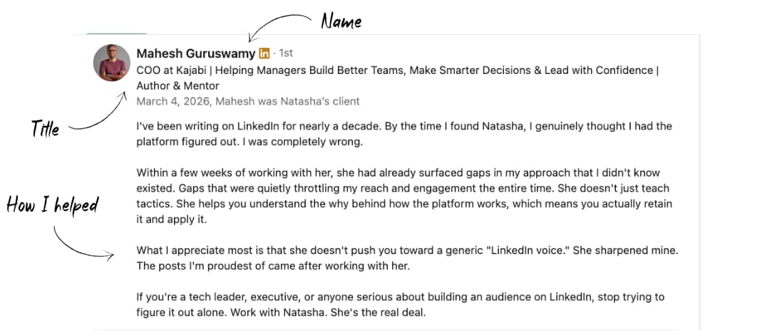 Hey Reader! Want to know the most underutilized part of most people's LinkedIn profile? → Recommendations. You may think no one looks at them, but if someone's about to spend $1000s with you, you bet they're going to check you out everywhere. They might not notice if you don't have any.But they will sure notice if you do. Here's a recommendation I got last week: This is from Mahesh Guruswamy, who was the CTO of Kickstarter when we worked together. He's now the COO at Kajabi. When someone is...